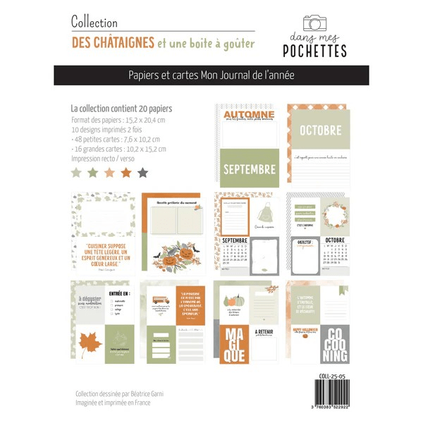 Pochette de 20 papiers imprimés 15,2 x 20,4 cm (6 x 4 inch) recto/verso de la collection Des châtaignes et une boîte à goûter par Dans mes pochettes.